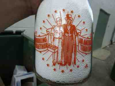 1940's WWII Era Milk Bottle, Excellent Condition with vibrant orange pyro paint. Dacro / Protected / Broughton's / Pasteurized / Dairy Products // Working / Together / ( Milk Man and Uncle Sam ) / An American / Tradition No cracks or chips. Please ask any questions before you bid. Bottle will be well packaged and Shipped with USPS Priority Mail. Please check out my other WWII era milk bottles I have listed.